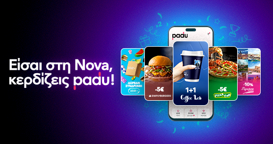 Ακόμη περισσότερα exclusive Nova Deals, με πρόσβαση σε 1.000+ σημεία εξαργύρωσης σε όλη την Ελλάδα, μέσω της συνεργασίας με το padu.